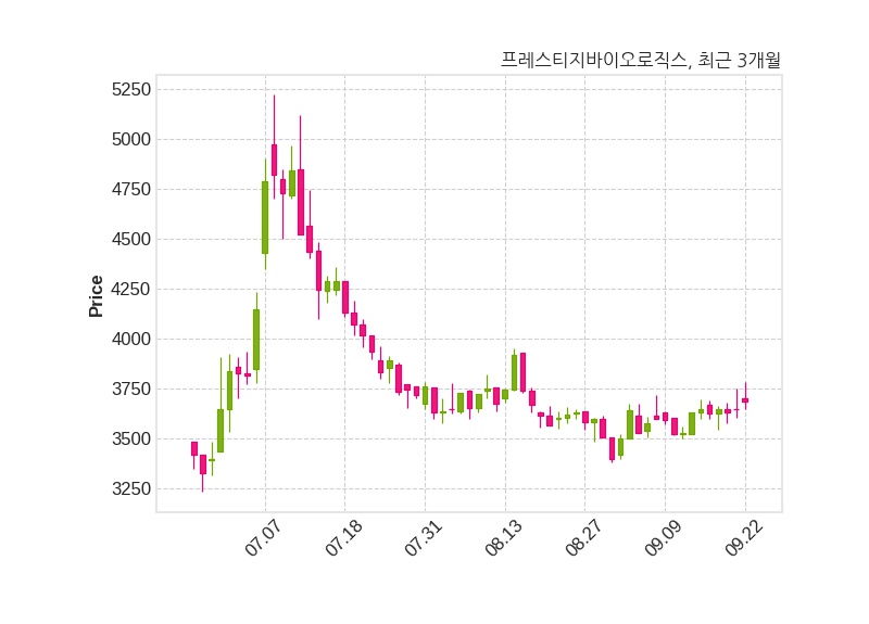 한편, 프레스티지바이오로직스는 장 마감 이후 해당 기업공시를 발표했으며 오늘 종가가 3,685원, 거래량은 222,748주로, 직전 거래일 대비 35원(+0.96%) 상승했다.