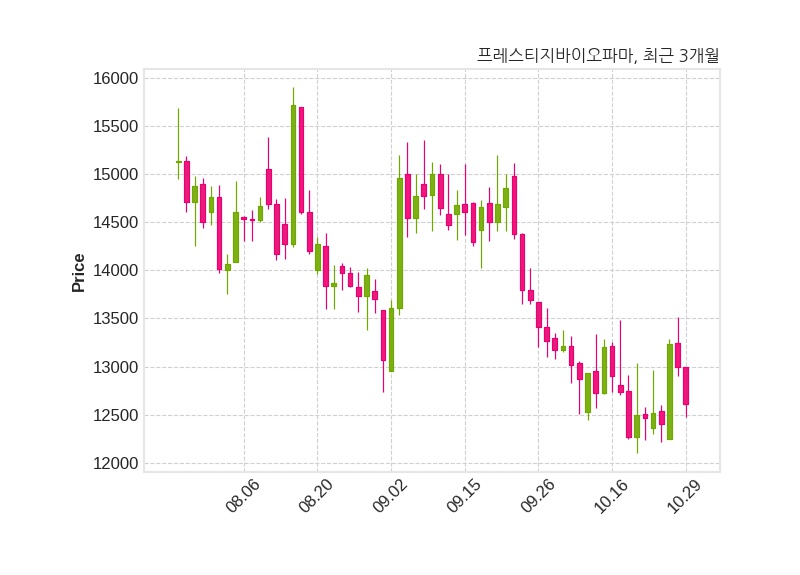 한편, 프레스티지바이오파마는 장 마감 이후 해당 기업공시를 발표했으며 오늘 종가가 12,610원, 거래량은 126,946주로, 직전 거래일 대비 390원(-3.0%) 하락했다.