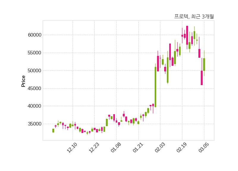 한편, 프로텍의 11시 36분 현재주가는 53,400원으로 직전 거래일 대비 7,400원(+16.09%) 상승이며, 거래량은 84,638주이다.