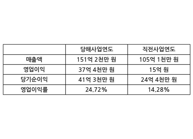 이번사업연도의 매출액은 직전사업연도 대비 43.8% 증가한 151억 2천만 원, 영업이익은 37억 4천만 원, 당기순이익은 41억 3천만 원이라고 공시했다.
