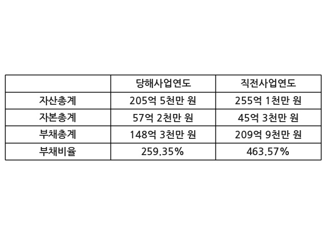 또한, 이번사업연도의 자산총계는 205억 5천만 원으로 직전사업연도 대비 -19.44% 감소한 한편, 부채총계는 148억 3천만 원으로 -29.32% 감소, 자본총계는 57억 2천만 원으로 26.34% 증가했다.