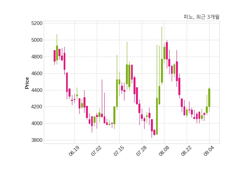 한편, 피노의 14시 31분 현재주가는 4,415원으로 직전 거래일 대비 215원(+5.12%) 상승이며, 거래량은 280,313주이다.