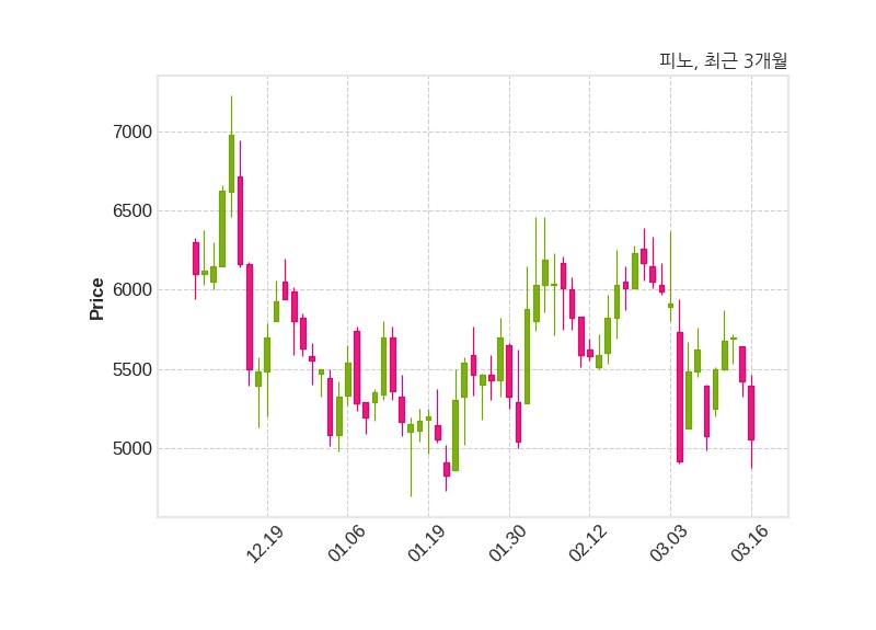 한편, 피노의 13시 33분 현재주가는 5,050원으로 직전 거래일 대비 370원(-6.83%) 하락이며, 거래량은 603,842주이다.