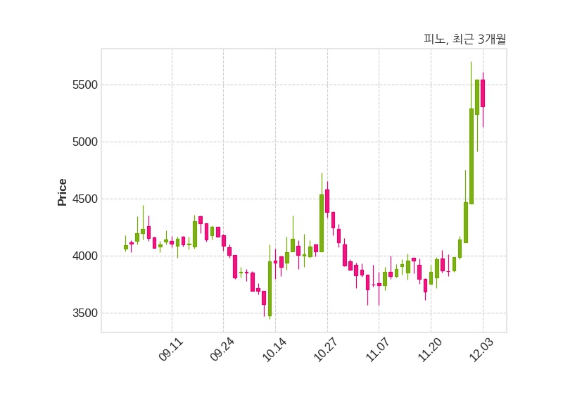 한편, 피노는 장 마감 이후 해당 기업공시를 발표했으며 오늘 종가가 5,310원, 거래량은 531,440주로, 직전 거래일 대비 230원(-4.15%) 하락했다.