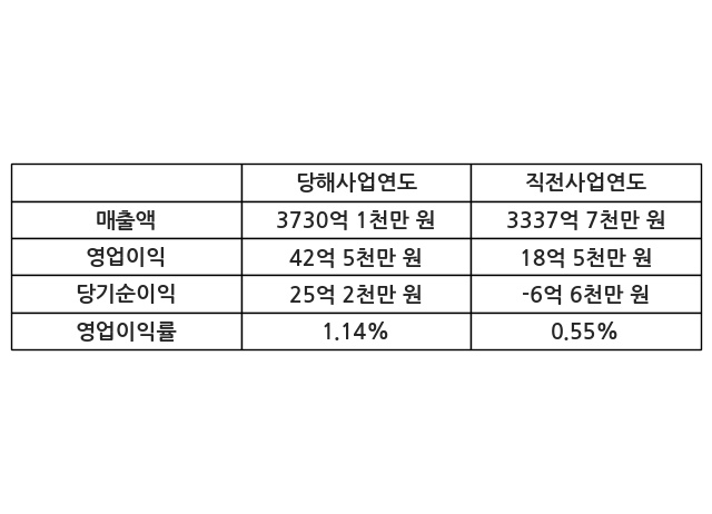 이번사업연도의 매출액은 직전사업연도 대비 11.76% 증가한 3730억 1천만 원, 영업이익은 42억 5천만 원, 당기순이익은 25억 2천만 원이라고 공시했다.