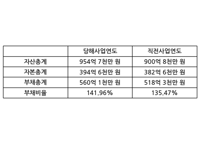 또한, 이번사업연도의 자산총계는 954억 7천만 원으로 직전사업연도 대비 5.98% 증가한 한편, 부채총계는 560억 1천만 원으로 8.08% 증가, 자본총계는 394억 6천만 원으로 3.14% 증가했다.