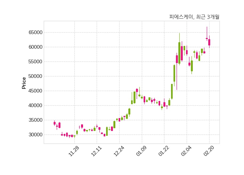 한편, 피에스케이는 장 마감 이후 해당 기업공시를 발표했으며 오늘 종가가 60,600원, 거래량은 419,702주로, 직전 거래일 대비 2,200원(-3.5%) 하락했다.