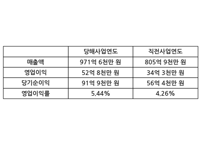 이번사업연도의 매출액은 직전사업연도 대비 20.57% 증가한 971억 6천만 원, 영업이익은 52억 8천만 원, 당기순이익은 91억 9천만 원이라고 공시했다.