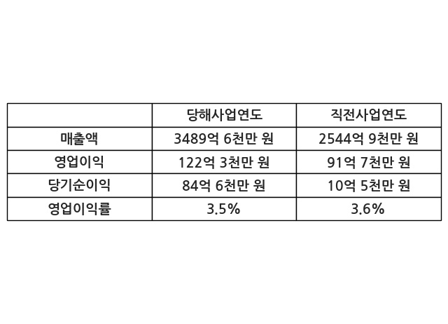 이번사업연도의 매출액은 직전사업연도 대비 37.12% 증가한 3489억 6천만 원, 영업이익은 122억 3천만 원, 당기순이익은 84억 6천만 원이라고 공시했다.