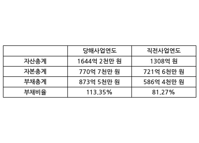 또한, 이번사업연도의 자산총계는 1644억 2천만 원으로 직전사업연도 대비 25.7% 증가한 한편, 부채총계는 873억 5천만 원으로 48.96% 증가, 자본총계는 770억 7천만 원으로 6.8% 증가했다.