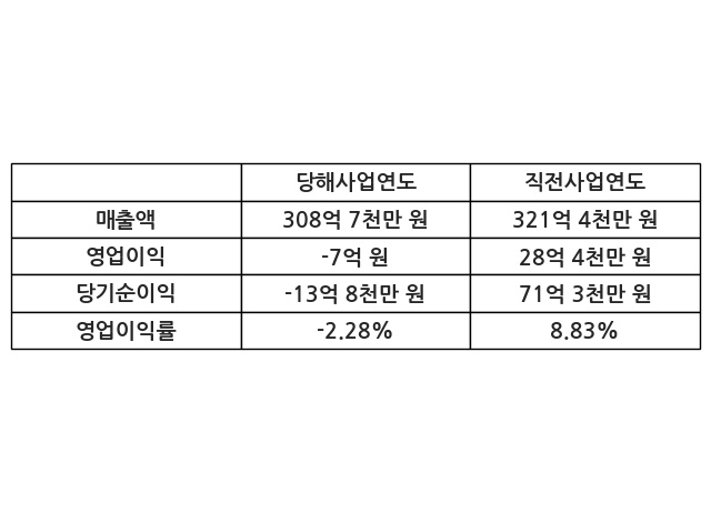 이번사업연도의 매출액은 직전사업연도 대비 -3.96% 감소한 308억 7천만 원, 영업이익은 -7억 원, 당기순이익은 -13억 8천만 원이라고 공시했다.