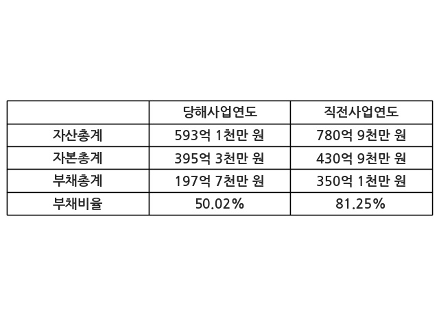 또한, 이번사업연도의 자산총계는 593억 1천만 원으로 직전사업연도 대비 -24.05% 감소한 한편, 부채총계는 197억 7천만 원으로 -43.52% 감소, 자본총계는 395억 3천만 원으로 -8.24% 감소했다.