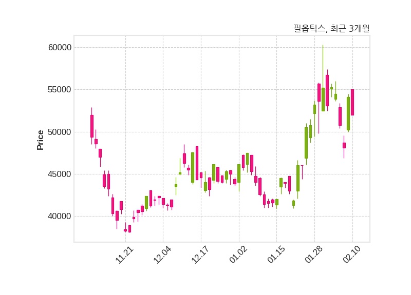 한편, 필옵틱스는 장 마감 이후 해당 기업공시를 발표했으며 오늘 종가가 52,000원, 거래량은 348,019주로, 직전 거래일 대비 2,100원(-3.88%) 하락했다.