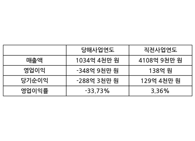 이번사업연도의 매출액은 직전사업연도 대비 -74.83% 감소한 1034억 4천만 원, 영업이익은 -348억 9천만 원, 당기순이익은 -288억 3천만 원이라고 공시했다.
