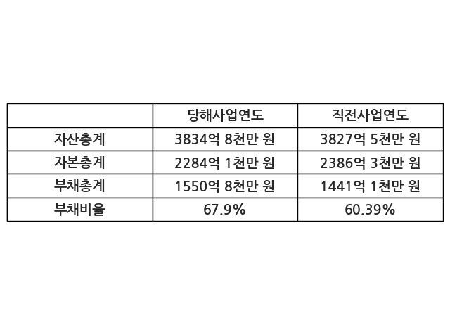 또한, 이번사업연도의 자산총계는 3834억 8천만 원으로 직전사업연도 대비 0.19% 증가한 한편, 부채총계는 1550억 8천만 원으로 7.61% 증가, 자본총계는 2284억 1천만 원으로 -4.29% 감소했다.