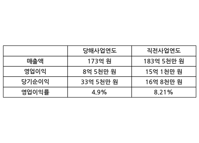 이번사업연도의 매출액은 직전사업연도 대비 -5.73% 감소한 173억 원, 영업이익은 8억 5천만 원, 당기순이익은 33억 5천만 원이라고 공시했다.