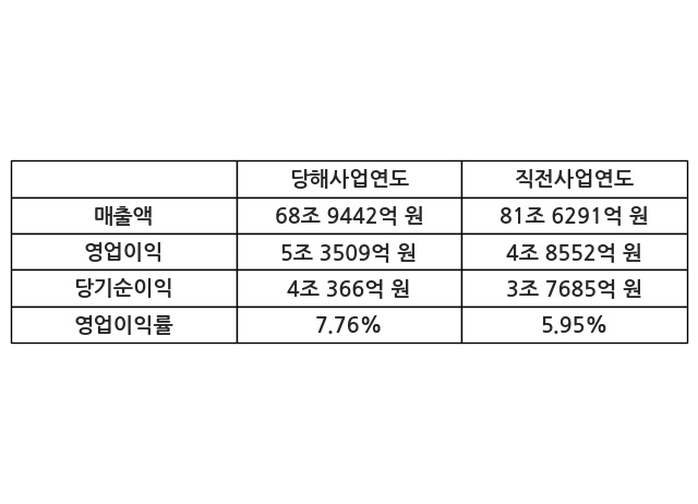 이번사업연도의 매출액은 직전사업연도 대비 -15.54% 감소한 68조 9442억 원, 영업이익은 5조 3509억 원, 당기순이익은 4조 366억 원이라고 공시했다.