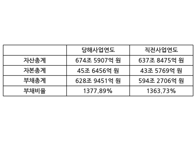 또한, 이번사업연도의 자산총계는 674조 5907억 원으로 직전사업연도 대비 5.76% 증가한 한편, 부채총계는 628조 9451억 원으로 5.83% 증가, 자본총계는 45조 6456억 원으로 4.75% 증가했다.