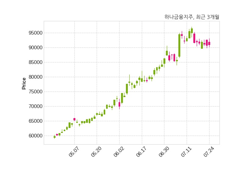 한편, 하나금융지주는 장 마감 이후 해당 기업공시를 발표했으며 오늘 종가가 91,000원, 거래량은 725,860주로, 직전 거래일 대비 200원(+0.22%) 상승했다.