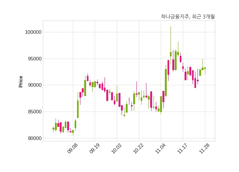 한편, 하나금융지주의 15시 21분 현재주가는 93,300원으로 직전 거래일 대비 변동없으며, 거래량은 499,214주이다.