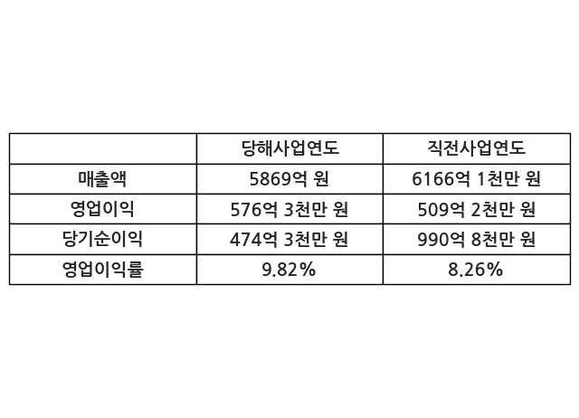 이번사업연도의 매출액은 직전사업연도 대비 -4.82% 감소한 5869억 원, 영업이익은 576억 3천만 원, 당기순이익은 474억 3천만 원이라고 공시했다.