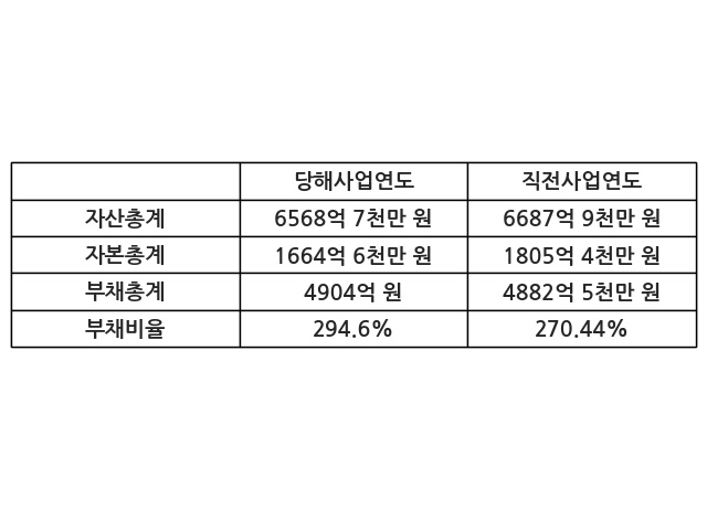또한, 이번사업연도의 자산총계는 6568억 7천만 원으로 직전사업연도 대비 -1.78% 감소한 한편, 부채총계는 4904억 원으로 0.44% 증가, 자본총계는 1664억 6천만 원으로 -7.8% 감소했다.