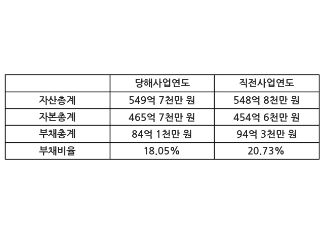 또한, 이번사업연도의 자산총계는 549억 7천만 원으로 직전사업연도 대비 0.17% 증가한 한편, 부채총계는 84억 1천만 원으로 -10.81% 감소, 자본총계는 465억 7천만 원으로 2.45% 증가했다.