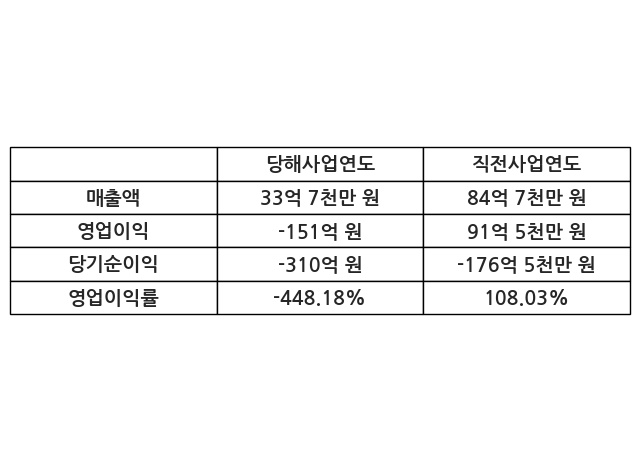 이번사업연도의 매출액은 직전사업연도 대비 -60.21% 감소한 33억 7천만 원, 영업이익은 -151억 원, 당기순이익은 -310억 원이라고 공시했다.