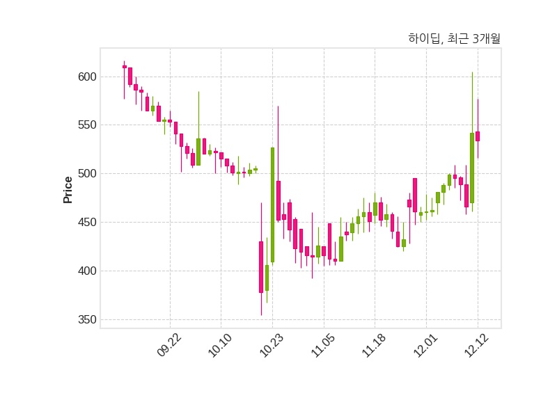 한편, 하이딥은 장 마감 이후 해당 기업공시를 발표했으며 오늘 종가가 534원, 거래량은 2,262,978주로, 직전 거래일 대비 8원(-1.48%) 하락했다.