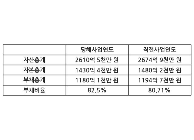 또한, 이번사업연도의 자산총계는 2610억 5천만 원으로 직전사업연도 대비 -2.41% 감소한 한편, 부채총계는 1180억 1천만 원으로 -1.22% 감소, 자본총계는 1430억 4천만 원으로 -3.36% 감소했다.