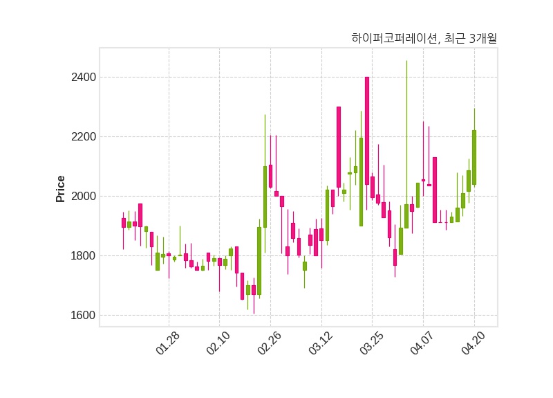 한편, 하이퍼코퍼레이션은 장 마감 이후 해당 기업공시를 발표했으며 오늘 종가가 2,220원, 거래량은 427,063주로, 직전 거래일 대비 135원(+6.47%) 상승했다.