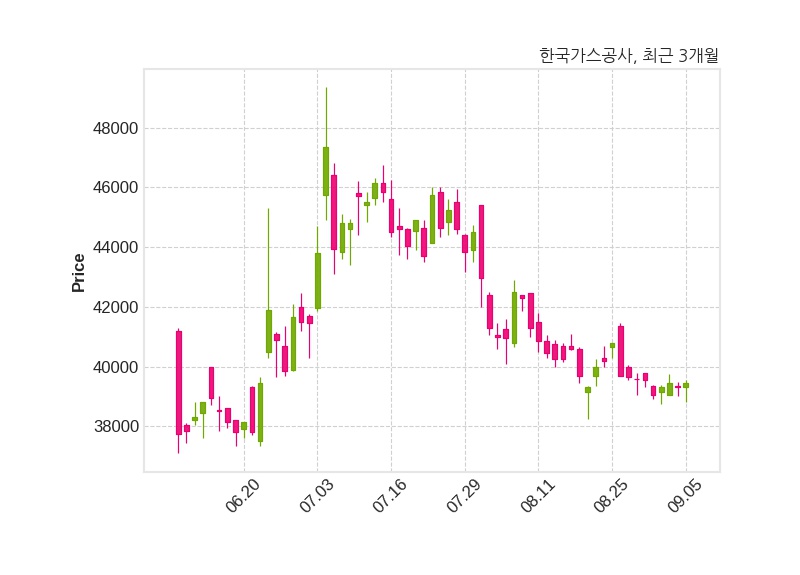 한편, 한국가스공사의 13시 56분 현재주가는 39,450원으로 직전 거래일 대비 150원(+0.38%) 상승이며, 거래량은 194,654주이다.