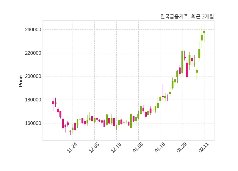 한편, 한국금융지주의 14시 45분 현재주가는 238,500원으로 직전 거래일 대비 3,000원(+1.27%) 상승이며, 거래량은 216,745주이다.
