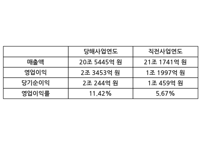 이번사업연도의 매출액은 직전사업연도 대비 -2.97% 감소한 20조 5445억 원, 영업이익은 2조 3453억 원, 당기순이익은 2조 244억 원이라고 공시했다.