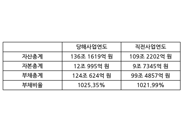 또한, 이번사업연도의 자산총계는 136조 1619억 원으로 직전사업연도 대비 24.67% 증가한 한편, 부채총계는 124조 624억 원으로 24.7% 증가, 자본총계는 12조 995억 원으로 24.29% 증가했다.