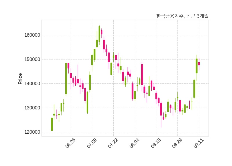 한편, 한국금융지주는 장 마감 이후 해당 기업공시를 발표했으며 오늘 종가가 147,600원, 거래량은 495,974주로, 직전 거래일 대비 2,600원(-1.73%) 하락했다.