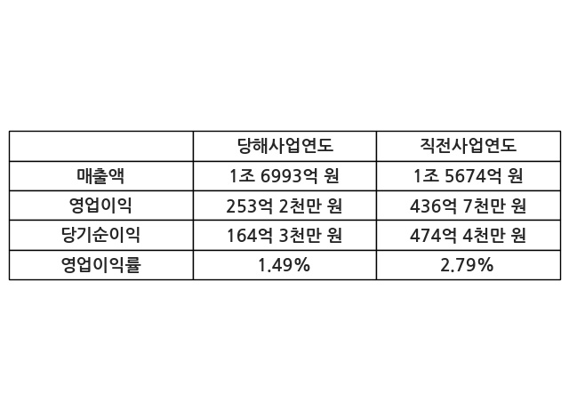 이번사업연도의 매출액은 직전사업연도 대비 8.42% 증가한 1조 6993억 원, 영업이익은 253억 2천만 원, 당기순이익은 164억 3천만 원이라고 공시했다.
