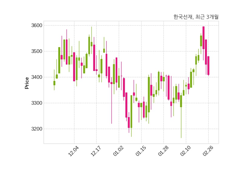 한편, 한국선재는 장 마감 이후 해당 기업공시를 발표했으며 오늘 종가가 3,410원, 거래량은 191,053주로, 직전 거래일 대비 40원(-1.16%) 하락했다.