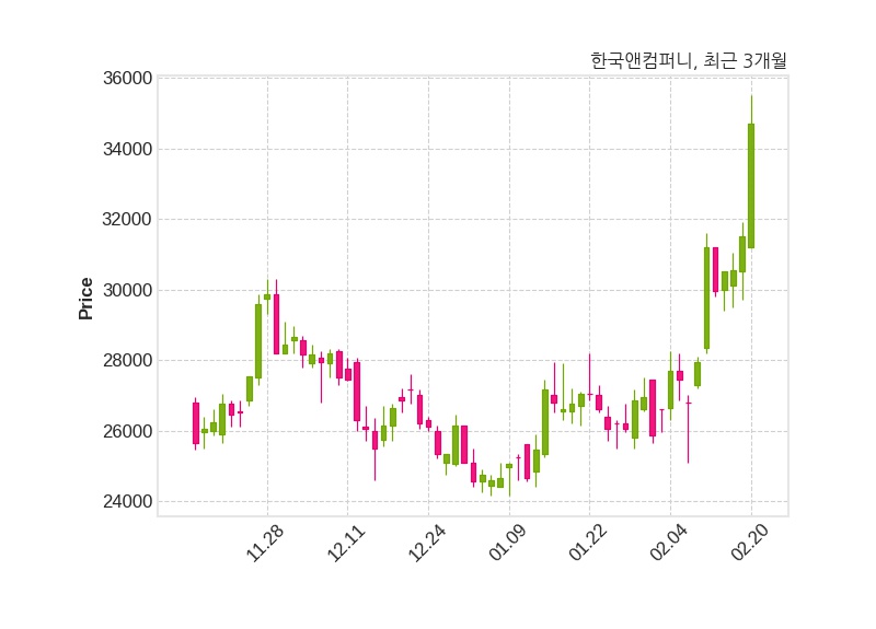 한편, 한국앤컴퍼니의 15시 25분 현재주가는 34,700원으로 직전 거래일 대비 3,200원(+10.16%) 상승이며, 거래량은 338,284주이다.