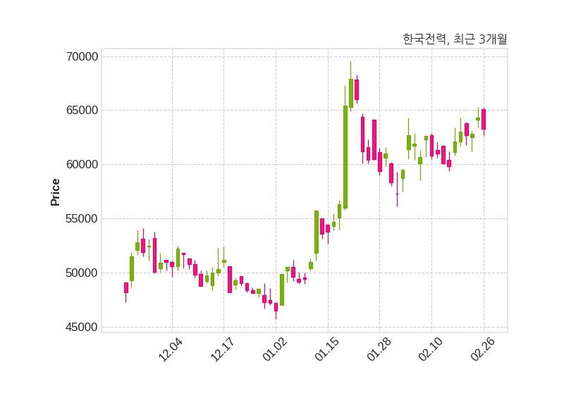 한편, 한국전력공사는 장 마감 이후 해당 기업공시를 발표했으며 오늘 종가가 63,300원, 거래량은 2,436,442주로, 직전 거래일 대비 1,000원(-1.56%) 하락했다.