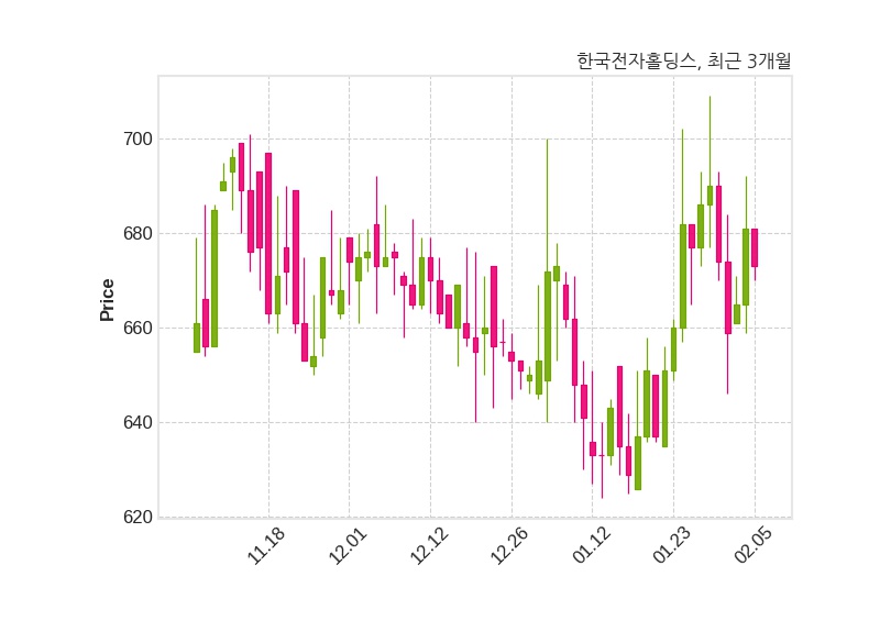 한편, 한국전자홀딩스는 장 마감 이후 해당 기업공시를 발표했으며 오늘 종가가 673원, 거래량은 89,144주로, 직전 거래일 대비 8원(-1.17%) 하락했다.