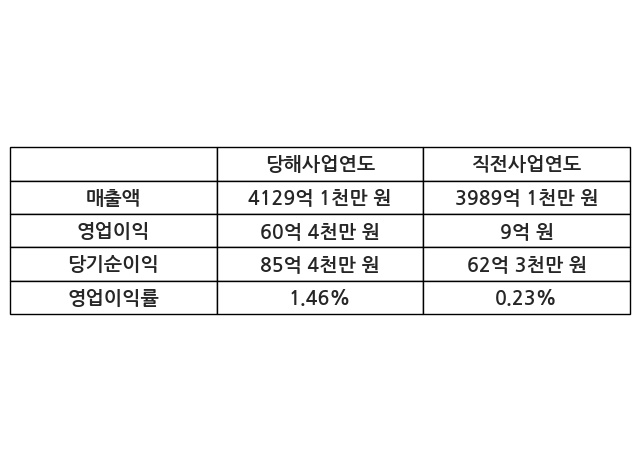 이번사업연도의 매출액은 직전사업연도 대비 3.51% 증가한 4129억 1천만 원, 영업이익은 60억 4천만 원, 당기순이익은 85억 4천만 원이라고 공시했다.