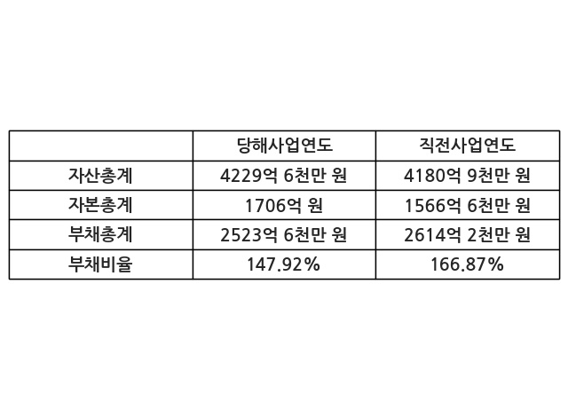 또한, 이번사업연도의 자산총계는 4229억 6천만 원으로 직전사업연도 대비 1.17% 증가한 한편, 부채총계는 2523억 6천만 원으로 -3.47% 감소, 자본총계는 1706억 원으로 8.9% 증가했다.