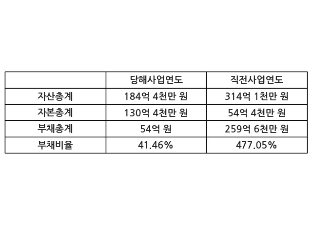 또한, 이번사업연도의 자산총계는 184억 4천만 원으로 직전사업연도 대비 -41.28% 감소한 한편, 부채총계는 54억 원으로 -79.18% 감소, 자본총계는 130억 4천만 원으로 139.53% 증가했다.