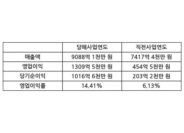 이번사업연도의 매출액은 직전사업연도 대비 22.52% 증가한 9088억 1천만 원, 영업이익은 1309억 5천만 원, 당기순이익은 1016억 6천만 원이라고 공시했다.