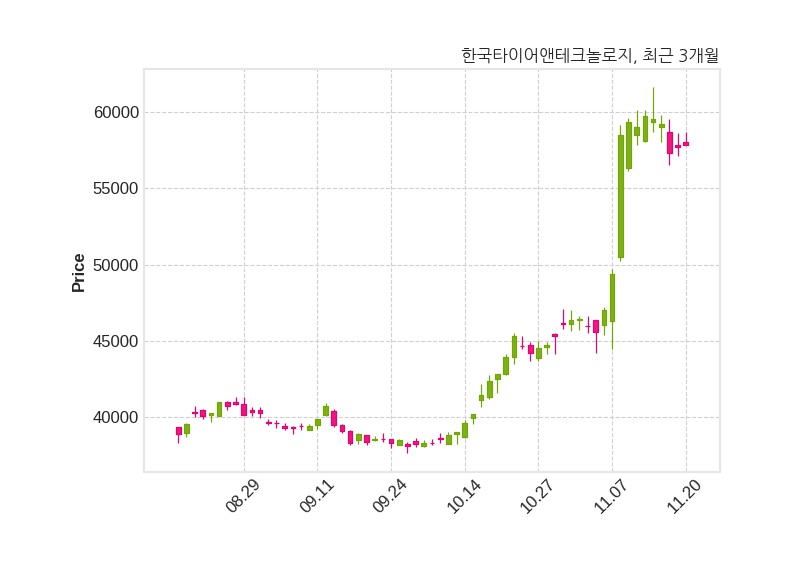 한편, 한국타이어앤테크놀로지의 10시 02분 현재주가는 57,800원으로 직전 거래일 대비 100원(+0.17%) 상승이며, 거래량은 30,657주이다.