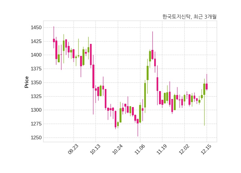 한편, 한국토지신탁은 장 마감 이후 해당 기업공시를 발표했으며 오늘 종가가 1,338원, 거래량은 441,979주로, 직전 거래일 대비 10원(-0.74%) 하락했다.