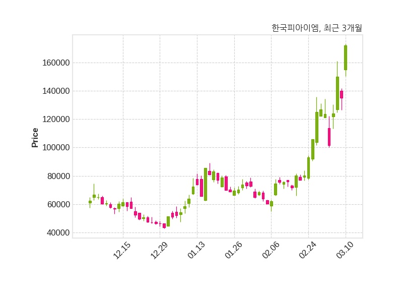 한편, 한국피아이엠의 14시 51분 현재주가는 171,900원으로 직전 거래일 대비 36,900원(+27.33%) 상승이며, 거래량은 395,161주이다.