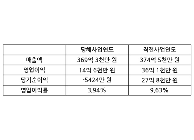 이번사업연도의 매출액은 직전사업연도 대비 -1.38% 감소한 369억 3천만 원, 영업이익은 14억 6천만 원, 당기순이익은 -5424만 원이라고 공시했다.
