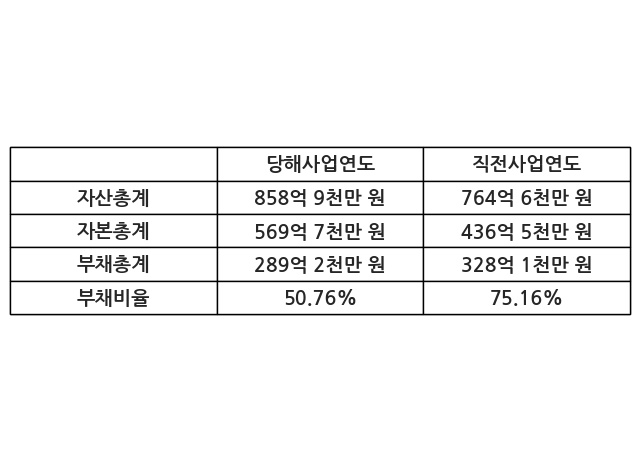 또한, 이번사업연도의 자산총계는 858억 9천만 원으로 직전사업연도 대비 12.33% 증가한 한편, 부채총계는 289억 2천만 원으로 -11.85% 감소, 자본총계는 569억 7천만 원으로 30.51% 증가했다.